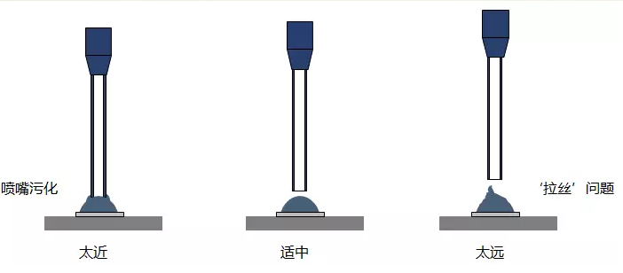 3.拉絲高度:由于某些膠水的黏度較大,在勻速緩慢上抬一段距離才能將膠絲拉斷,不影響涂膠軌跡,這段距離稱為拉絲高度。