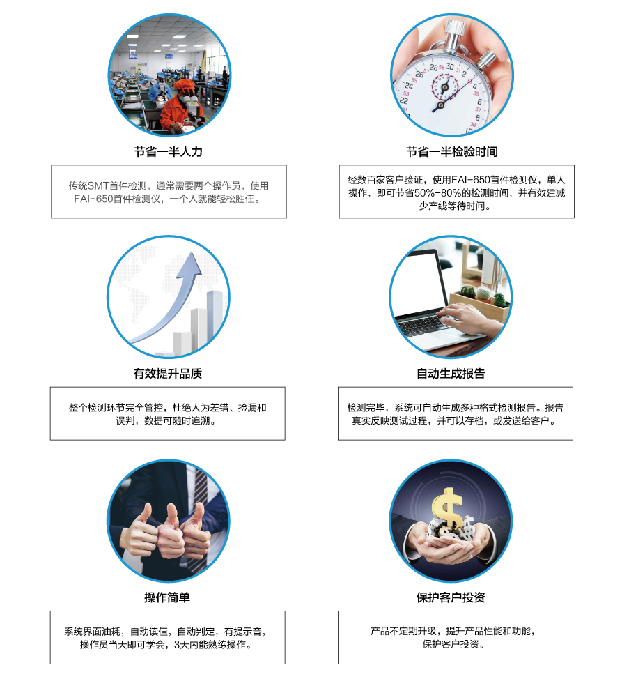 當今SMT電子工廠,多機種、小批量、換線頻,使得首件檢測的任務(wù)越發(fā)繁重。傳統(tǒng)的SMT首件檢測方法,不僅浪費人力,效率低下,整個首件檢測過程缺乏管控,品質(zhì)難以得到保證。針對此難題,深圳市藍眼科技有限公司首創(chuàng)了SMT首件檢測儀,通過不斷升級優(yōu)化,現(xiàn)已研發(fā)出第四代首件檢測儀FAI-650,具有以下顯著優(yōu)勢: