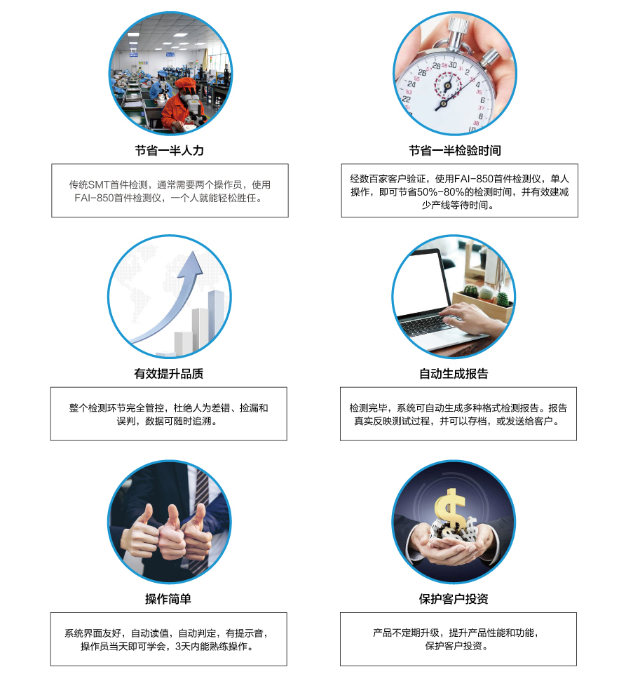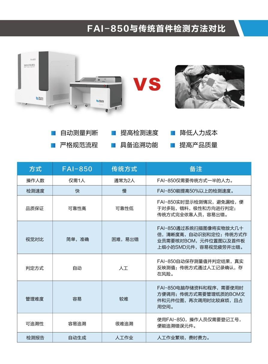 當今SMT電子工廠,多機種、小批量、換線頻,使得首件檢測的任務越發(fā)繁重。傳統(tǒng)的SMT首件檢測方法,不僅浪費人力,效率低下,整個首件檢測過程缺乏管控,品質(zhì)難以得到保證。針對此難題,深圳市藍眼科技有限公司首創(chuàng)了SMT首件檢測儀,通過不斷升級優(yōu)化,現(xiàn)已研發(fā)出第四代首件檢測儀FAI-850,具有以下顯著優(yōu)勢: